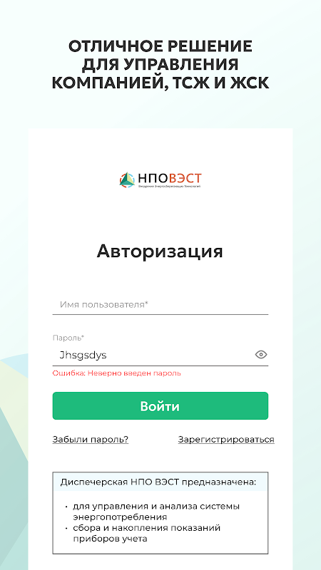 該應用程式補充了用於傳輸、儲存、分析和呈現資料的程式的瀏覽器版本(以下簡稱 Dispatcher NPO VEST、Dispatcher),可讓您讀取、存檔、處理和顯示來自最常見設備的資料:熱能計量(熱計算器VKT-7、TEM-05、TEM-104、TEM-106、Multical、TV-7等)、電錶(Milur)、可程式邏輯控制器(PLC)VEST等設備。
