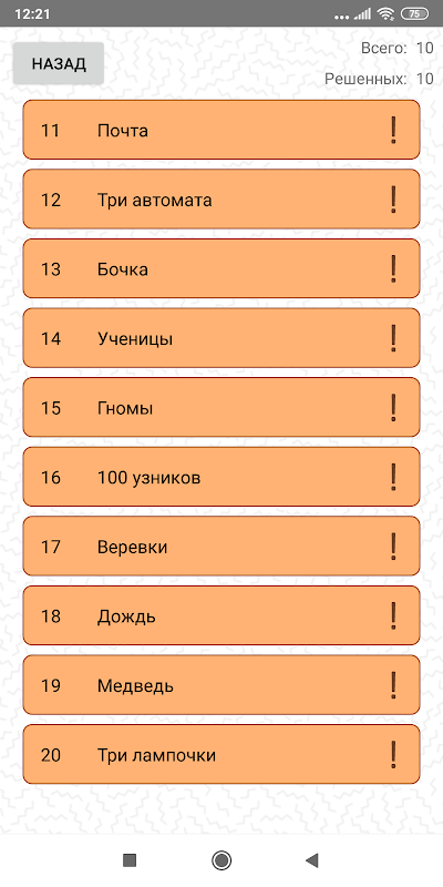 10 уровней с головоломками, загадками с ответами. Будь внимательнее - могут попадаться загадки с подвохом. Хорошо подходит чтобы размять мозги