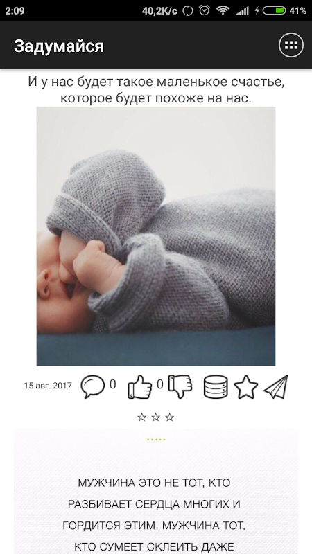 Понравившиеся записи можно комментировать и оценивать. Все понравившиеся картинки можно сохранять в галерее устройства в папке приложения. Ты можешь делиться записями с друзьями через социальные сети, а так же другие установленные на устройстве приложения. Ну и конечно, ты можешь оставлять лайки и сохранять записи в избранное.