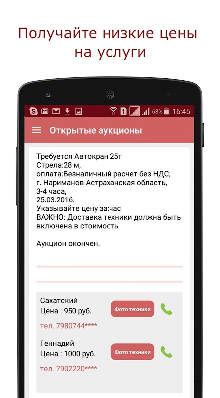 Сервис позволяет запускать аукцион в любое удобное время. Владельцы техники получают ваш заказ в течение 1 минуты и уже через 7 минут вы получаете лучшие цены на аренду нужной вам спецтехники в своем городе, а также телефоны исполнителей, готовых выполнить работу.