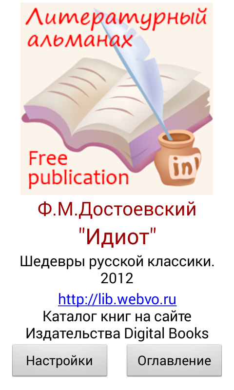 數位圖書出版社致力於古典文學作品的普及和對新人作家的支持。我們以基於Android作業系統的行動裝置應用程式的形式出版書籍。使用簡單的選單,每個讀者都可以自訂書籍的顯示,以適應其設備的特性。