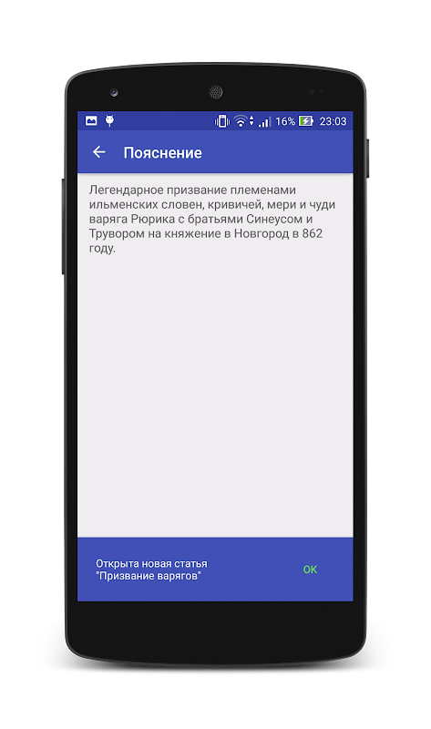 Приложение не стремится заменить научную книгу, но оно лучше, чем просто краткая история или набор фактов. Новый увлекательный способ изучения истории позволяет в процессе чтения статьи открывать новые статьи с помощью специальных ссылок. Таким образом, можно последовательно, шаг за шагом узнавать о происшедших событиях в истории России от Рюрика и до наших дней. После прочтения статьи Вы можете пройти тест, где Вам будет предложено некоторое количество вопросов. Это поможет закрепить пройденный материал, а Вы сможете перейти к другим статьям.