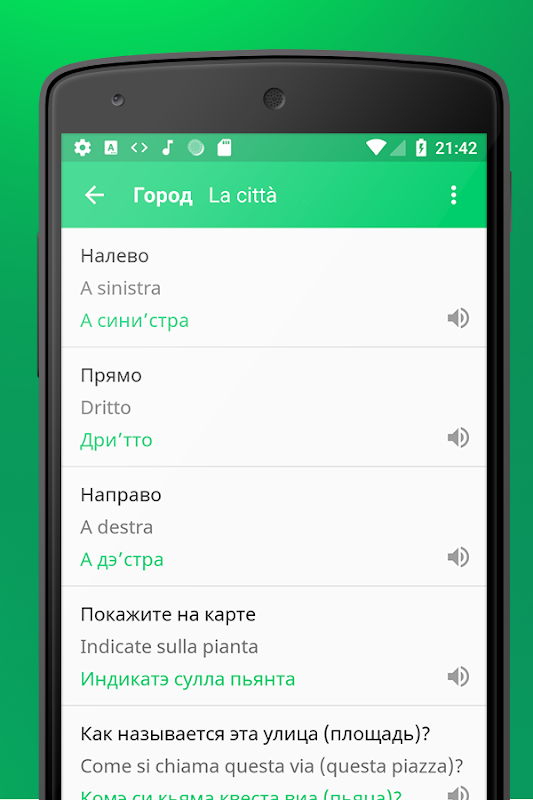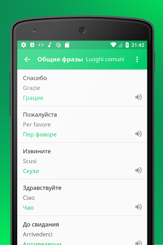 俄語 - 意大利語短語也可以作為俄語 - 意大利語翻譯離線。畢竟,應用程序中的單詞和短語經常出現在現實生活中。