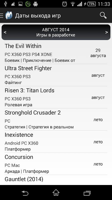Календарь Игр - это приложение для Android, с помощью которого Вы будете всегда в курсе выхода всех игр на любых платформах. Так же Вы можете посмотреть краткое описание для конкретной игры, посмотреть свежее видео, скриншоты, а так же обои из игры.