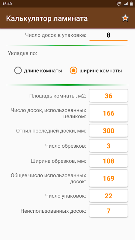 Приложение Калькулятор ламината (расчет ламината) позволяет рассчитать количество ламината, нужное для укладки на пол. Калькулятор учитывает способ укладки: прямой, диагональный. Для расчета вам достаточно ввести размеры помещения, а также доски ламината. Вы можете узнать не только количество упаковок ламината, но также количество досок использованных целиком, количество неиспользованных досок.