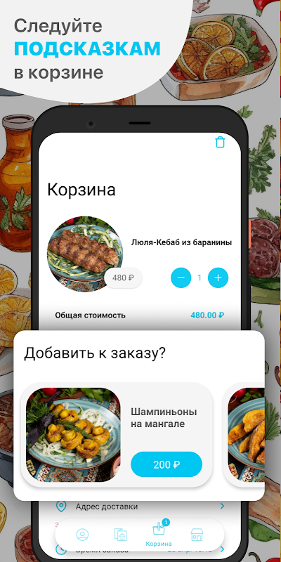如何在Cafe Sim-Sim應用程序中下訂單:從菜單中選擇所需的項目,將其添加到購物籃中,然後轉到結帳屏幕(通過單擊購物籃圖標)。