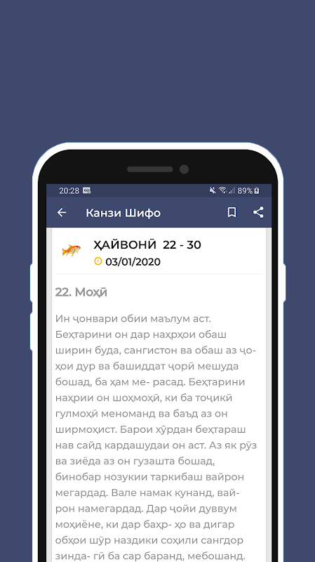 Канзи Шифо точики барои скачать кардан омода мебошад. Мисол мохи: Ин ҷонвари обии маълум аст. Беҳтарини он дар наҳрҳои обаш ширин буда, сангистон ва обаш аз ҷо- ҳои дур ва башиддат ҷорӣ мешуда бошад, ба ҳам ме- расад. Беҳтарини наҳрии он шоҳмоҳӣ, ки ба тоҷикӣ гулмоҳӣ меноманд ва баъд аз он ширмоҳист. Барои хӯрдан беҳтараш нав сайд кардашудаи он аст. Аз як рӯз ва зиёда аз он гузашта бошад, бинобар нозукии таркибаш вайрон мегардад. Вале намак кунанд, вай- рон намегардад. Дар ҷойи дуввум моҳиёне, ки дар баҳр- ҳо ва дигар обҳои шӯр наздики соҳили сангдор зинда- гӣ ба сар баранд, мебошанд. Мизоҷи ҳамаи моҳиён сард дар дараҷаи якум ва тар дар дуввум аст.