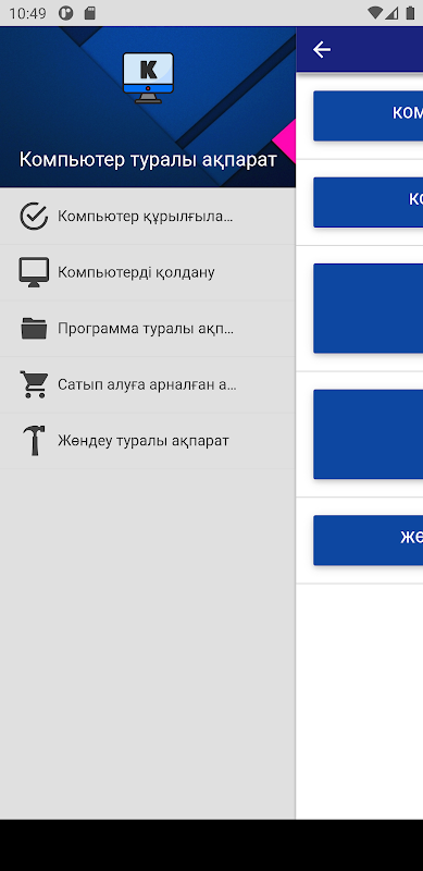 Бұл мобильдік қосымшада компьютер туралы ақпарат жинақталған. Олар: