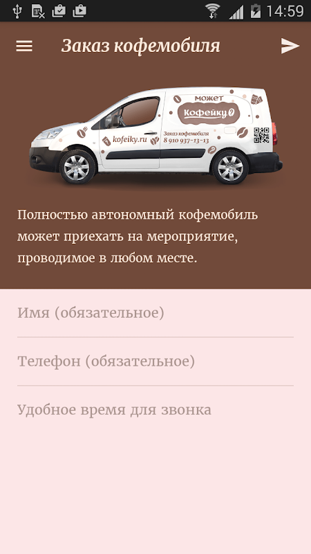 Наш полностью автономный кофемобиль может приехать на мероприятие, проводимое в любом месте. Ваши гости будут приятно удивлены интересным и неординарным решением автокофейни, а наш отменный кофе никого не оставит равнодушным. Заказать кофемобиль на мероприятия вам позволит наше мобильное приложение.