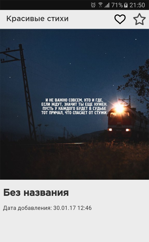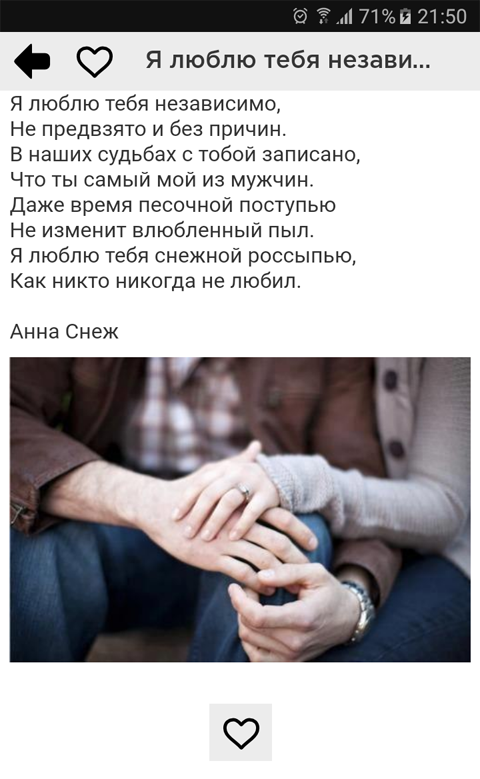 В приложение «Красивые стихи» вы найдете множество уникальных авторских текстов (стихи и проза), которые можно подарить близким и любимым людям. Имеются высказывания на все случаи жизни: романтические, любовные, тематические, именные. Приложение регулярно пополняется новыми тестами, которые помогут вам оригинально признаться в любви, сказать как сильно вы скучаете в разлуке с любимым человеком, пожелать ему доброго утра, хорошего дня или приятных снов.