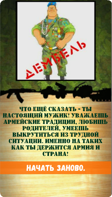 Ты начинаешь обычным призывником в военкомате, а можешь закончить почетным дембелем, или... лучше пройди тест и узнай сам!