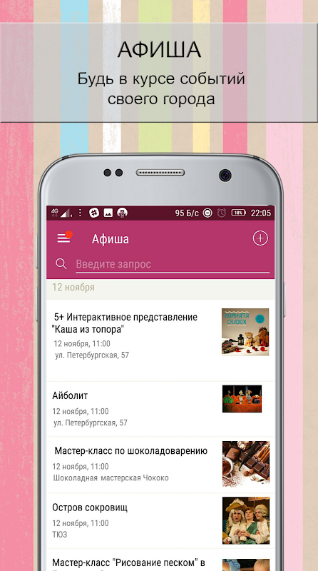 - Будь в курсе событий! Все мероприятия родного города у тебя под рукой.