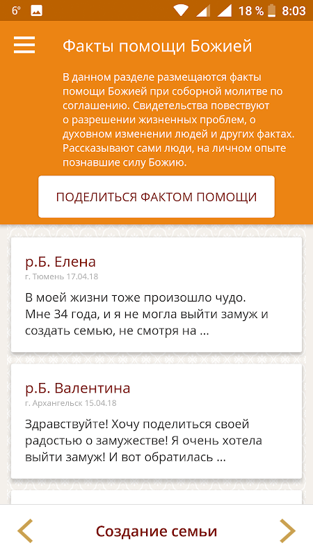 В приложение встроен раздел с живыми фактами помощи Божией. Как и на сайте, будет возможность поделиться со всеми интересующимися своим опытом.