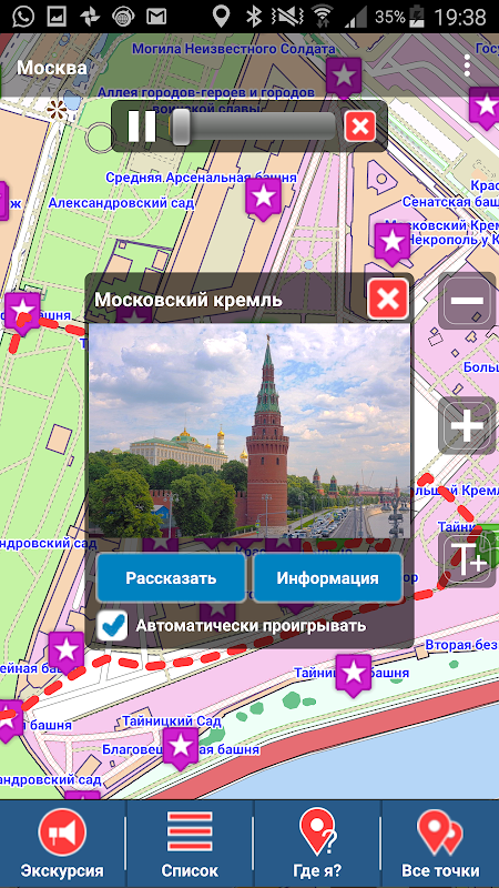 ●以自己的節奏在莫斯科散步。對於那些喜歡選擇自己的方向的人,可以採用自由行走模式。此外,遊覽路線中不會包含所有值得一遊的有趣景點。只需在目錄中選擇所需的地點,即可製定自己的步行計劃,它們會立即顯示在地圖上。在這種情況下,您可以從地圖上臨時刪除其他對象。