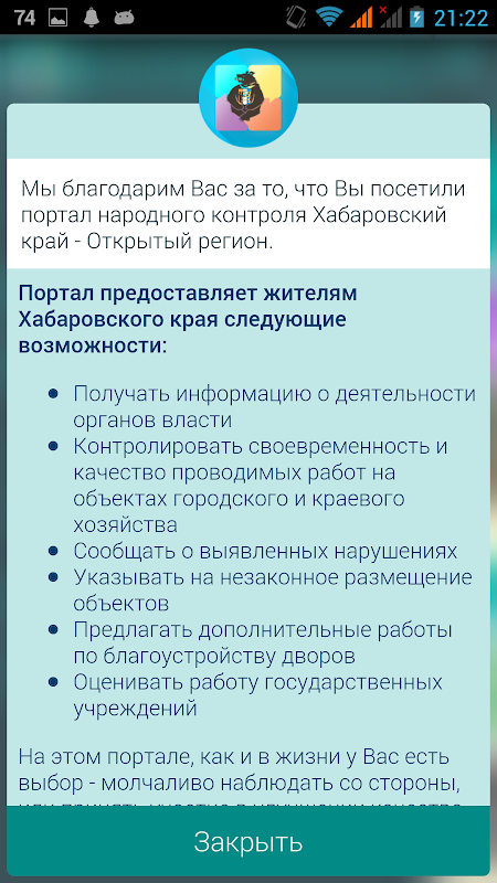 «Открытый регион» - это приложение для мобильных устройств на платформе Android, позволяющее жителям Хабаровского края получать информацию о деятельности органов власти, контролировать своевременность и качество проводимых работ на объектах городского и краевого хозяйства, сообщать о выявленных нарушениях, указывать на незаконное размещение объектов, предлагать дополнительные работы по благоустройству дворов, оценивать работу государственных учреждений.