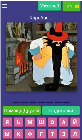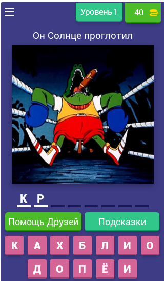 В приложение встроена система подсказок. Если не сможете вспомнить название мультипликационного героя, то смело пользуйтесь этой функцией. Она поможет пройти эту викторину до самого конца.