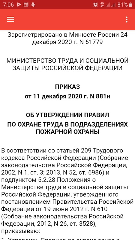 俄羅斯聯邦勞動和社會保護部20 N881н命令,“批准消防部門的勞動保護規則”