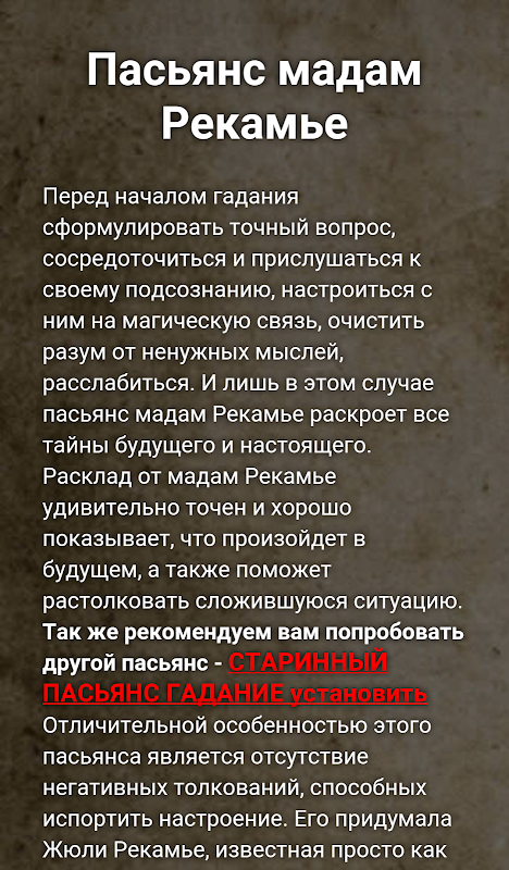 Сформулировать точный вопрос, и начинайте открывать карты. Отличительной особенностью этого пасьянса является отсутствие негативных толкований, способных испортить настроение. Его придумала Жюли Рекамье, известная просто как мадам Рекамье, красавица, хозяйка знаменитого литературно-политического салона.