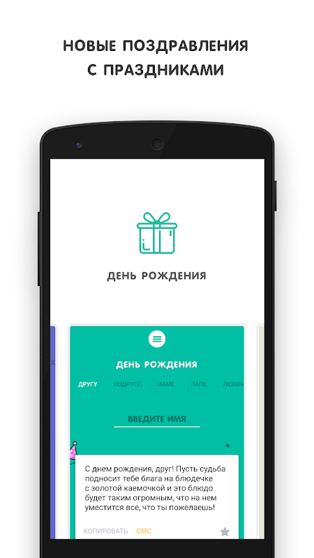 У друга свадьба, у мамы день рождения, а подруга закончила институт? Надо поздравить, но нет времени звонить? Тогда отправьте СМС с теплыми, приятными словами. Скачайте приложение и коллекция СМС поздравлений на все случаи жизни всегда будет под рукой - поздравления с ДР для любимого / любимой, родственников, с юбилеем, с Новым годом и Рождеством, с Днем России и Днем Победы, на выпускной и с рождением ребенка...