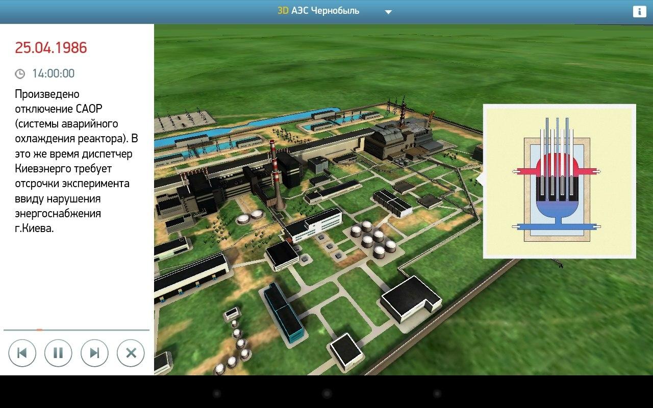 Данное приложение представляет собой 3х-мерную модель объектов АЭС, на которых произошли одни из самых крупных радиационных аварий в мире. В приложении воспроизведена хронология событий, в результате которых произошли инциденты, описаны меры, которые были приняты для устранения последствий аварий, и даны характеристики объектов на текущий момент.