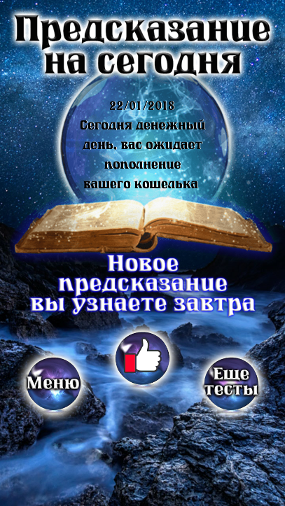 Вторая часть новых предсказаний на каждый день ждут тебя в 2018 году! Хочешь узнать что сегодня тебя ждет? Что уготовила тебе судьба? Какое будущее ожидает тебя в 2018 году? Наше приложение Предсказания на Каждый День 2.0 подскажет тебе, как лучше провести день, что ожидать от друзей и близких, и как повлияют твои поступки на твое будущее. Предсказания на Каждый День 2.0 покажет только одно предсказание на сегодняшний день на каждый знак гороскопа. Любовь или дружба, радость или расстройство, неожиданные приключения или скучный день, может предсказать наше приложение.