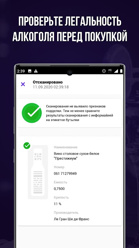Приложение Проверка Алкоголя - Штрих-код Сканер поможет Вам выбрать качественную алкогольную продукцию при помощи быстрого сканирования акцизной марки. Cканируйте бутылку перед покупкой, чтобы проверить легальность алкоголя.