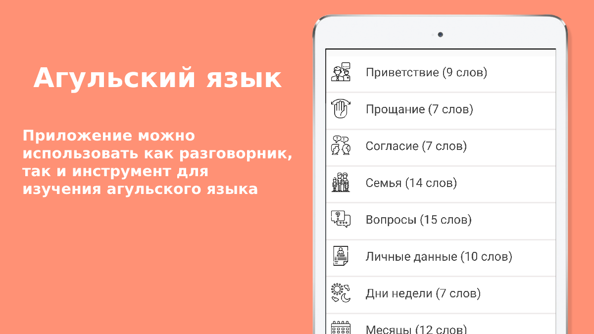 Русско-агульский разговорник можно использовать соответственно, как разговорник, так и инструмент для изучения агульского языка. Все агульские слова написаны русскими буквами и разбиты на 10 логических тем, то есть разговорник рассчитан на русскоговорящего пользователя (туриста).