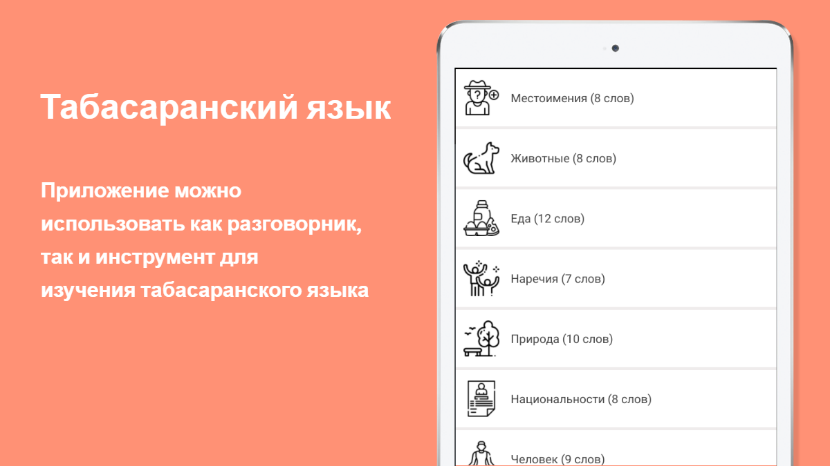 俄語-塔巴薩蘭語短語手冊既可以用作短語手冊,也可以用作學習Tabasaran語言的工具。 Tabasaran的所有單詞均以俄語字母書寫,並被分為15個邏輯主題,即,該短語手冊是為俄語用戶(遊客)設計的。