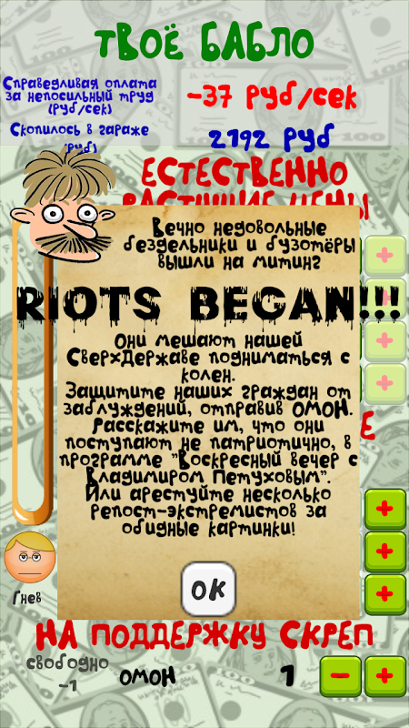 這是一個貪官的模擬器,你的目標是搶劫整個國家,讓人民不推翻你!你可以提高汽油和食品的價格,或者削減科學和健康方面的資金,但要小心,人民的憤怒會升級為集會並推翻你!因此,你可以用一整支軍隊包圍自己並安全,但軍隊也需要付出代價。制定自己的策略並賺錢!遊戲完全是俄語,離線工作。