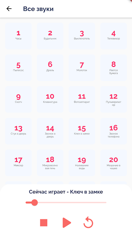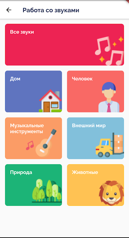 該應用程序使處理非語音聲音變得更加容易,使學習過程令人興奮,有趣,並且不會讓孩子感到無聊。除了帶有聲音的主要部分外,我們還提供了創建自己的聲音集的機會-這使您可以調整特定孩子的學習過程及其訓練水平。此外,還出現了其他任務,這些任務通過遊戲任務來稀釋訓練,從而增加了孩子對材料同化的投入。