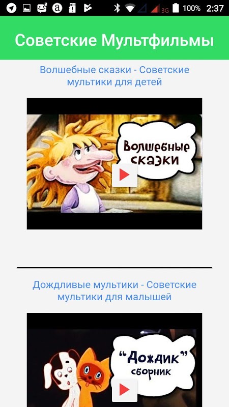 Приложение Советские Мультфильмы - это наши советские мультфильмы на вашем телефоне. Скачать советские мультфильмы вполне возможно, но не имеет смысла с приложением Советские Мультфильмы: ведь любимые мультфильмы теперь можно смотреть и без скачивания. Теперь вам доступны русские мультфильмы такие как: мультфильмы карусель, мультфильмы про новый год, Ну погоди, Простоквашино, Бременские Музыканты, 38 попугаев, и другие мультфильмы для детей. Наши советские мультфильмы - это в первую очередь мультфильмы для детей, но тем не менее и взрослые с большим удовольствием любят смотреть любимые мультфильмы своего детства - русские мультфильмы снятые во времена СССР. Советские мультфильмы скачать достаточно сложно, к тому же скачав мультфильмы для детей