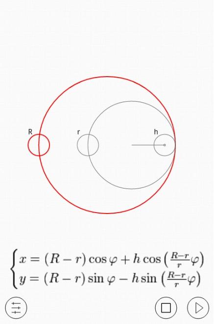 В режиме «Настройки» (самая левая кнопка) касаемся нужного кружка и двигаем вправо-влево (при этом пересчитывается и отображается на экране затухающий контур будущей гипотрохоиды)
