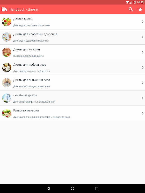 В приложении есть закладки и удобный поиск по названиям диет, так что Вы всегда сможете найти то, что Вам нужно и не потерять!