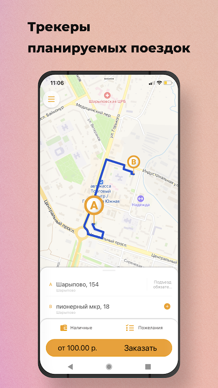 📱 Следите за поездкой на карте. Приложение сообщит время подачи, марку, цвет, номер машины, а также имя водителя.