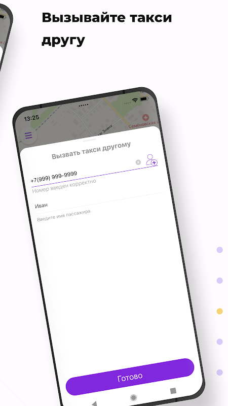 Используйте опцию “Вызвать такси другому” в разделе “Пожелания” и укажите его номер телефона. Когда такси подъедет, на указанный номер придет СМС, а вам — сообщение в приложении.