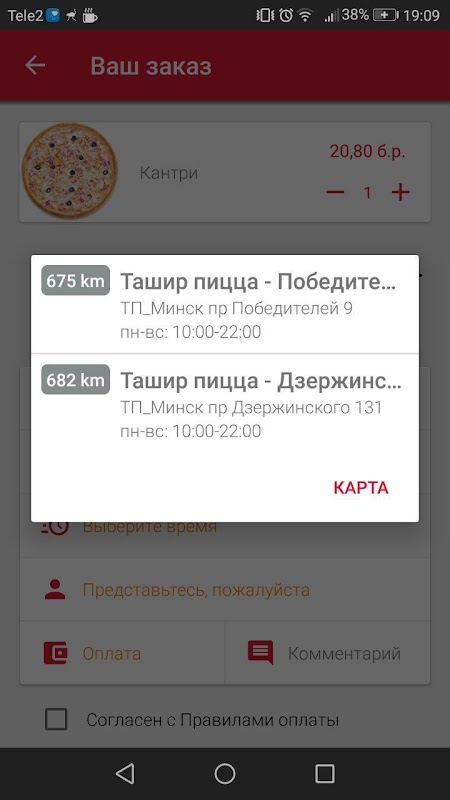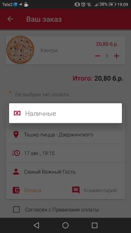 如何在附件TASHIR比薩訂購:從菜單中選擇自己喜歡的項目。它們添加到您的購物車並進行結算屏幕(按垃圾桶圖標)。