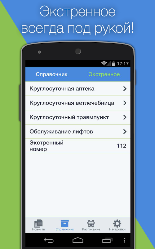 В приложении есть и контакты городских организаций. Справочник постоянно пополняется. В нем Вы найдете телефоны, адреса и графики работы управляющих компаний, участковых пунктов полиции, автоперевозчиков и т.п. Если Вы застряли в лифте, пригодится специальный раздел "Экстренное" - в нем собраны контакты "Лифтека". Здесь же - телефоны круглосуточной аптеки, ветклиники, травмпункта и т.д.