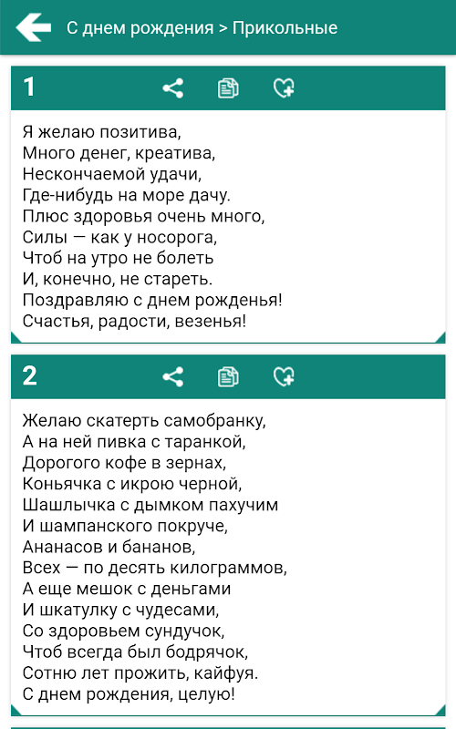 Огромное количество Текстовых поздравлений на все случаи жизни и смс. Поздравьте близкого человека с помощью нашего приложения, простым и незамысловатым образом, это поможет сделать праздник более теплым и уютным, Поздравления в стихах и прозе для родственников, любимых, друзей и подруг, коллегам и знакомым. Поздравления в стихах и прозе с днем рождения и юбилеем, прикольные тосты и свадебные поздравления. Поздравления и стихи к подаркам. Всё это и многое другое вы найдете в приложении. Отправляйте СМС приколы и стишки вашим друзьям. В приложении вы найдете Текстовые поздравления на все случаи жизни и смс с профессиональными и другими календарными праздниками, а также с различными важными событиями например С новым годом, С 8 марта, С 23 февраля и практически на любые другие. В приложении вы найдете поздравления по знаку зодиака и восточному гороскопу. Отправляйте поздравления в мессенджеры, смс, e-mail и др.