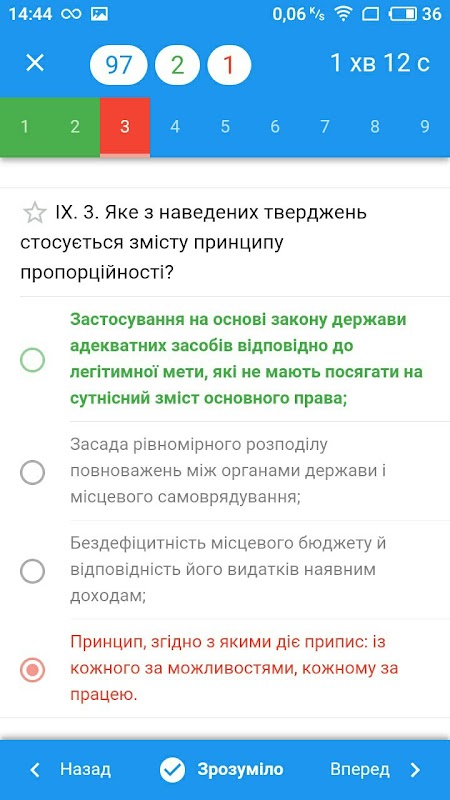 - Тестування по питанняx будь-яких вибраних розділів: підряд, випадково або за важкістю;