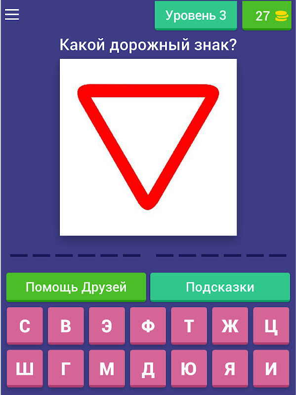 Правила как всегда мега простые: на каждом уровне вам показывается картинка на которой загадан дорожный знак. Он может быть любой из ПДД. Вам нужно из имеющихся букв подставить правильное слово и тем самым пройти уровень!