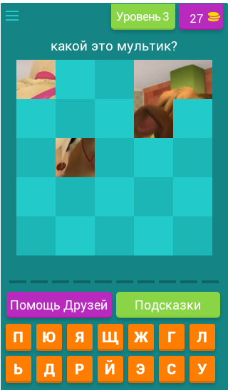 Изображение закрывают плитки, открыв часть картинки нужно догадаться как называется мультфильм или герой. (В зависимости от вопроса).
