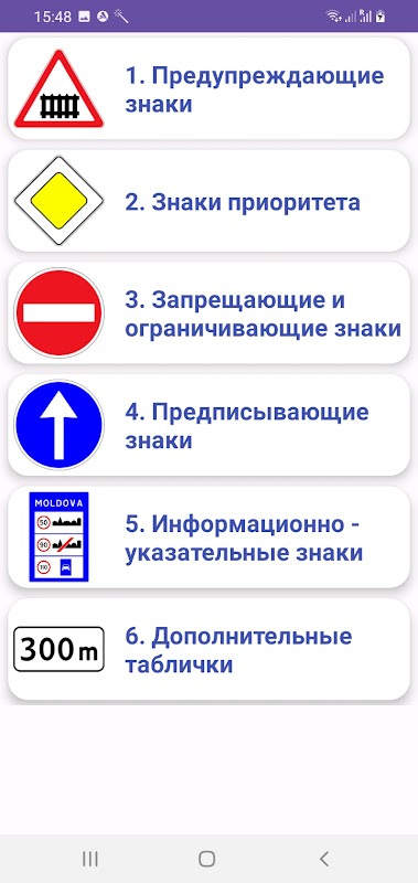 該應用程式包含摩爾多瓦共和國所有道路標誌的列表,以及它們的圖像、名稱、含義和應用程式描述。