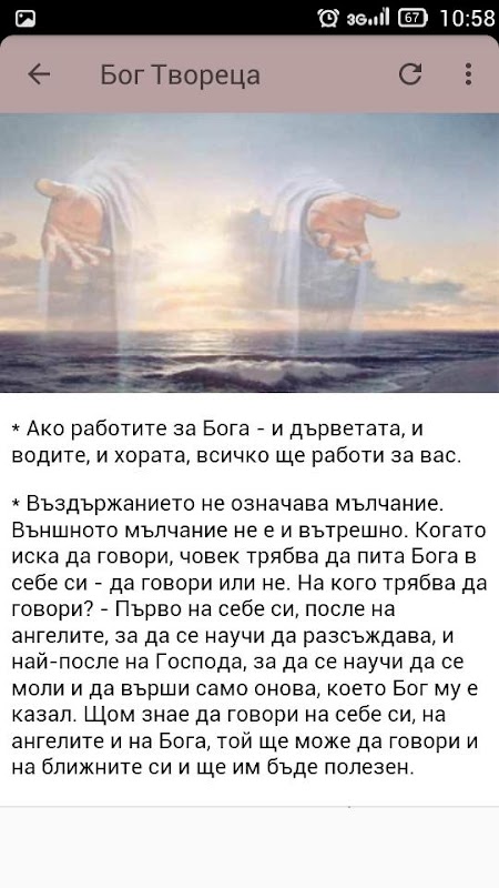 В приложението са подбрани негови мисли от беседите през годините. Това е едно зрънце от казаното от него, за: - аз и другите, за астрологията, за Бог, за аурата, за бъдещето, за вярата, за доброто и злото, за храненето.