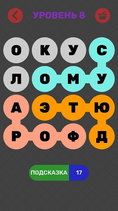Суть игры состоит в том, что вам нужно находить слова из предложенных букв в ячейках и затем проводить пальцем по экрану для их заполнения по горизонтали или вертикали. На самом деле всё очень просто, но с каждым пройденным уровнем будет всё сложнее, игра не даст Вам заскучать.