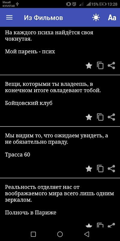 該應用程序包含以下主題的明智報價和格言:笑話,貧困,財富,戰爭,時間,悲傷的報價,兒童,友誼,生與死,法律,健康,書籍,電影,空間,美容,人物,時尚,激勵行情,明智行情,男人和女人,關於金錢,孤獨,關係,政治,背叛,樂趣,關於愛情,旅行,喝酒,工作,天堂與地獄,宗教,風險,俄羅斯,諷刺行情,自由,家庭,體育,幸福,足球。