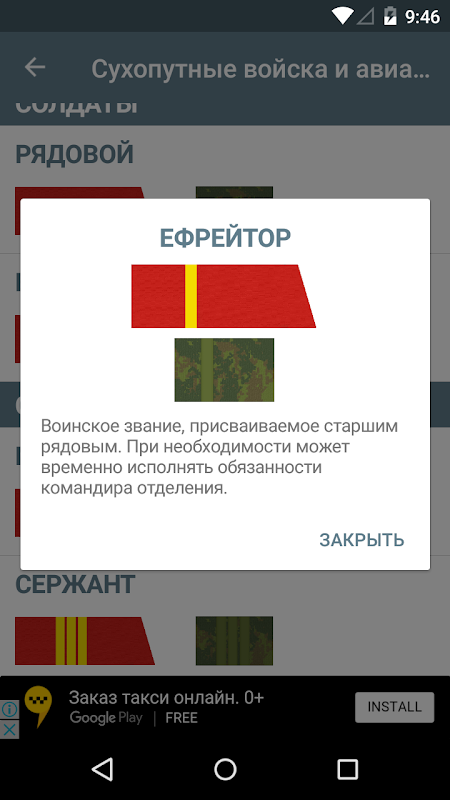 Завтра в армию, а ты не различаешь звездочки на погонах? Остановил ГАИшник, а ты не знаешь, как к нему обратиться? Это приложение поможет. Оно содержит звания и погоны военных и государственных ведомств Российской Федерации (в дальнейшем и других стран).