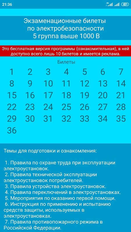 準備測試操作消費者電氣裝置的組織的電氣和電工技術人員的知識(1000 V 以上的電氣安全 V 組)。附錄根據Rostechnadzor 2021年問答版本編制。此程序為免費版(試用版),只有 10 張門票,且有廣告。