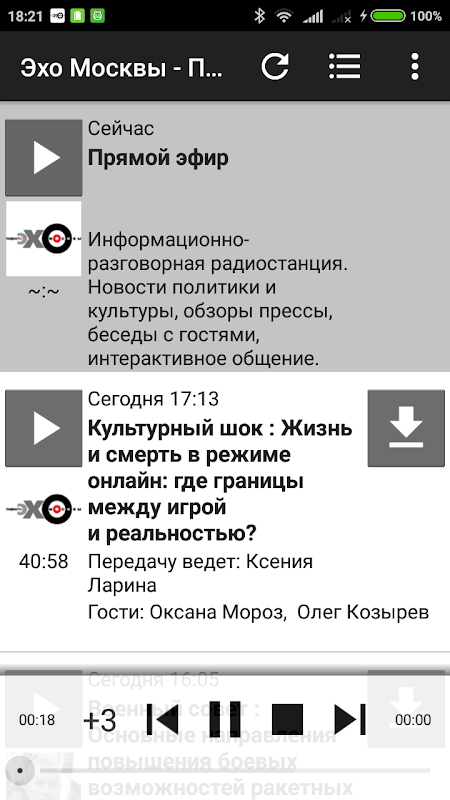 Приложение "Эхо Москвы - Подкасты" позволяет слушать радиопередачи Эхо Москвы. Если у Вас нет мобильного интернета, то можно предварительно скачать подкаст на телефон и затем слушать в любое время без доступа к интернету. Если мобильный интернет есть, то можно слушать передачи, нажав кнопку "плэй".