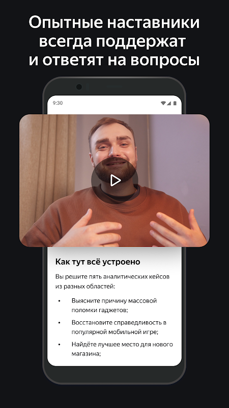課程計劃是在Yandex專家的指導下編寫的。我們定期研究市場並更新內容,以確保學生只獲得實用知識。我們還幫助您找到工作:我們頒發證書,教您如何撰寫履歷、作品集和求職信,提供合作夥伴職缺並進行測試面試。