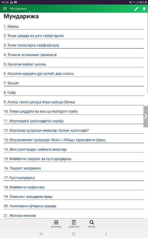 Муҳтарамўқувчиларгабумўжазрисоланиетказишданмақсадаҳлимўминларгаэнгзарурбўлааа Буларўлимтўшагилаётганкишигақилинадиганамаллар,вафотиданкейинқилинадиганамаллар,маййитнитаҳоратиҳақида,маййитниғуслқилдириш,кафанлаш,қабрковлаштартибивамурданилаҳадгақўйишмасалаларидир。 ункибумасалаларҳарбирмўминмусулмонфарзандиучунҳаётийзарурмасалалардир。 Шунингдек,муқаддасдинимиздагиэнгкўпбидъати/хурофотлараралашибкетганамал/бужанаиа。 Шубоисданбизфиқҳкитоблариданҳанафиймазҳабигаасосланганмасалалараинбаҳолиқудратёритиб。 Ушбурисолаўқувчибиродарларимизгаманфаатиетгудекбўлса,ниҳоятдамамнунбўларэдик。